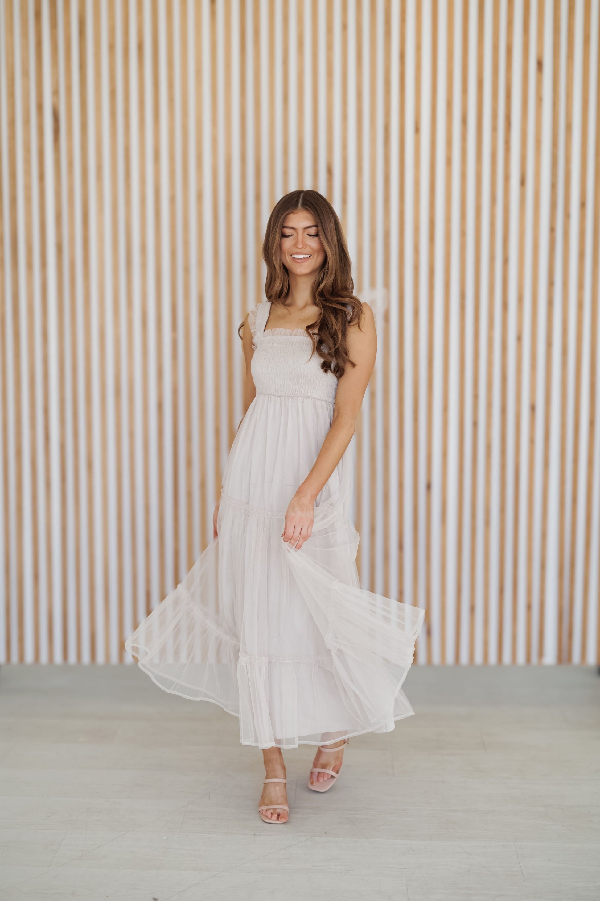 Turn heads in the "Roxanne Dress!" You are sure to be fit for any special holiday occasion in this champagne tulle midi dress! It boasts a fully smocked bust which offers a comfortable fit, along with a tiered tulle skirt. This dress is perfect to wear with heels for any festive date night or Christmas church service!